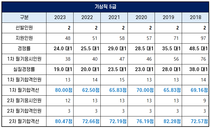 최근 시행된 5급 기상직 공무원 선발인원, 경쟁률, 필기 합격선 등을 아래 표로 정리했습니다(모바일 환경에서는 표 아래 있는 그림을 보시기 바랍니다).