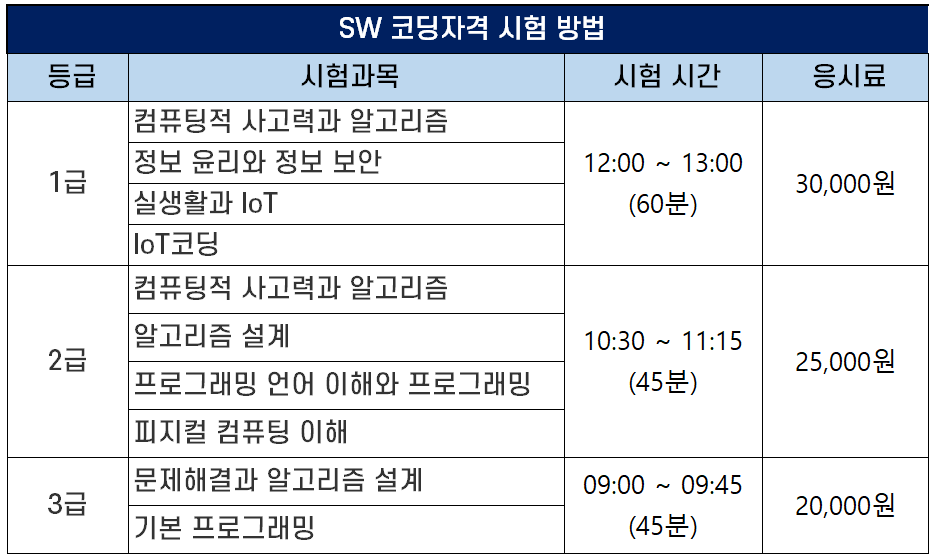 SW코딩자격 시험의 등급별 시험 과목과 시험 시간은 다음과 같습니다. 같은 날 시험을 보지만 시험 시간이 다르기 때문에 1급, 2급, 3급 동시 응시도 가능합니다.