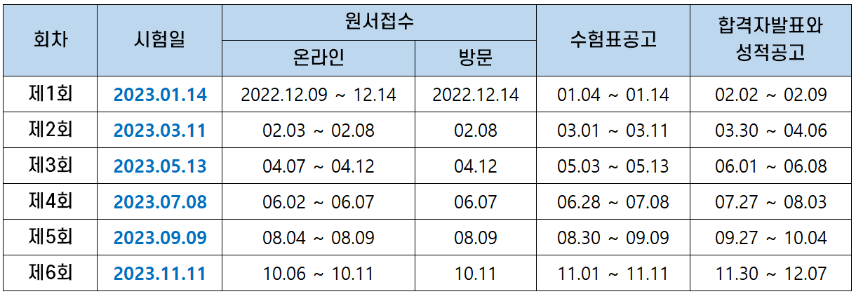 | 회차 | 시험일 | 원서접수 | 수험표공고 | 합격자발표와 성적공고 |