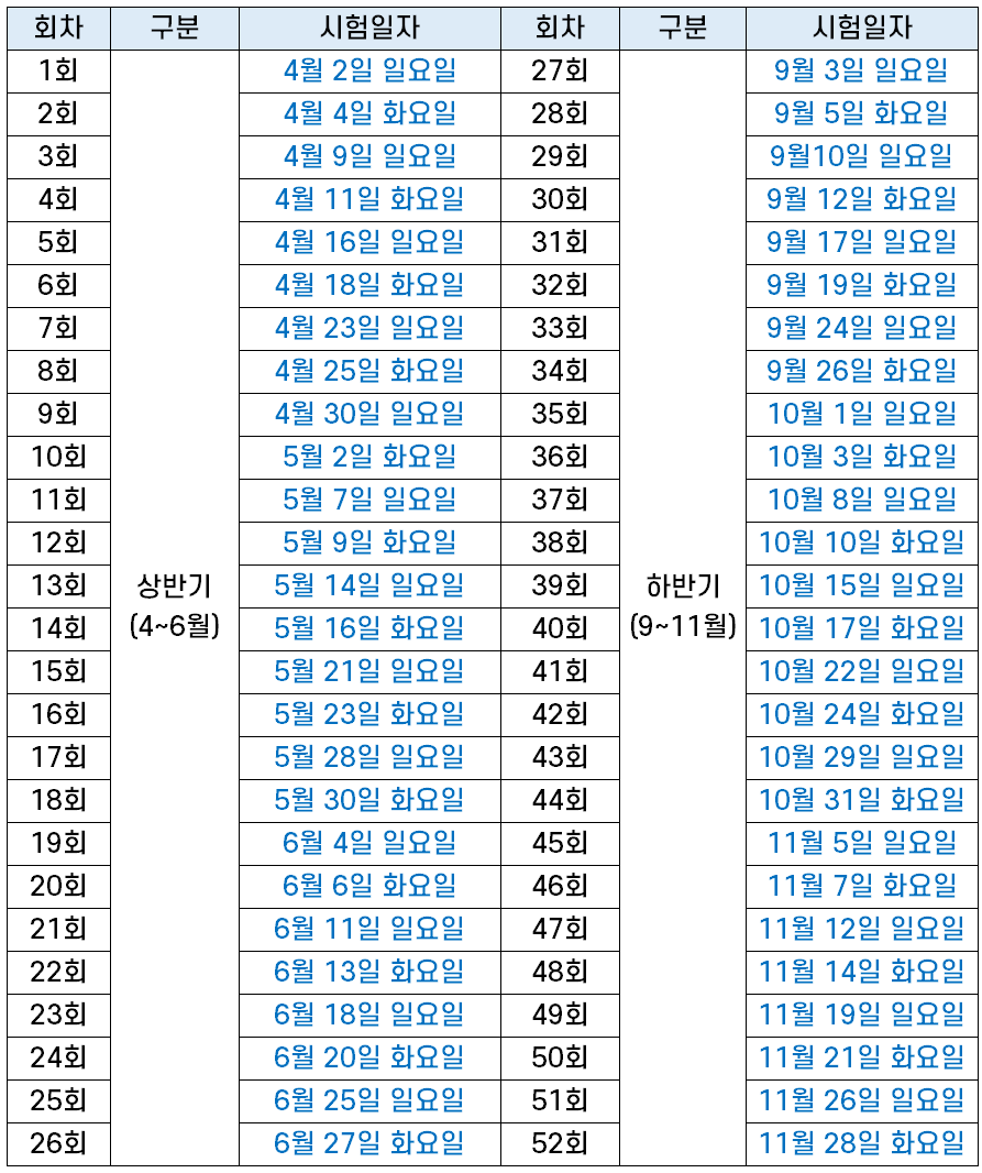 상반기에는 4~6월까지 매주 화요일과 일요일에 시험이 시행되어 총 26회 시험이 시행되고, 하반기에는 9~11월까지 역시 매주 화요일과 일요일에 시험이 시행되어 총 26회 시험이 시행됩니다.