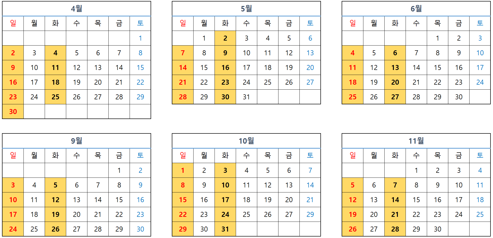 | 2회 | 4월 4일 화요일 | 28회 | 9월 5일 화요일 |