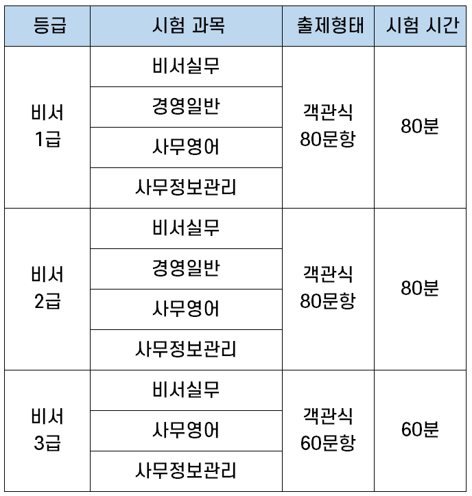 비서 자격증은 경영진의 업무를 보조할 수 있는 전문인력의 수요에 대응하고 그 능력을 객관적으로 검증하기 위해 도입된 자격증인데요. 시험과목과 난이도에 따라 1급, 2급, 3급으로 구분하고 있지만, 자격 취득에 순서가 있는 것은 아니며 본인의 실력에 따라 등급을 선택해 응시하면 됩니다.