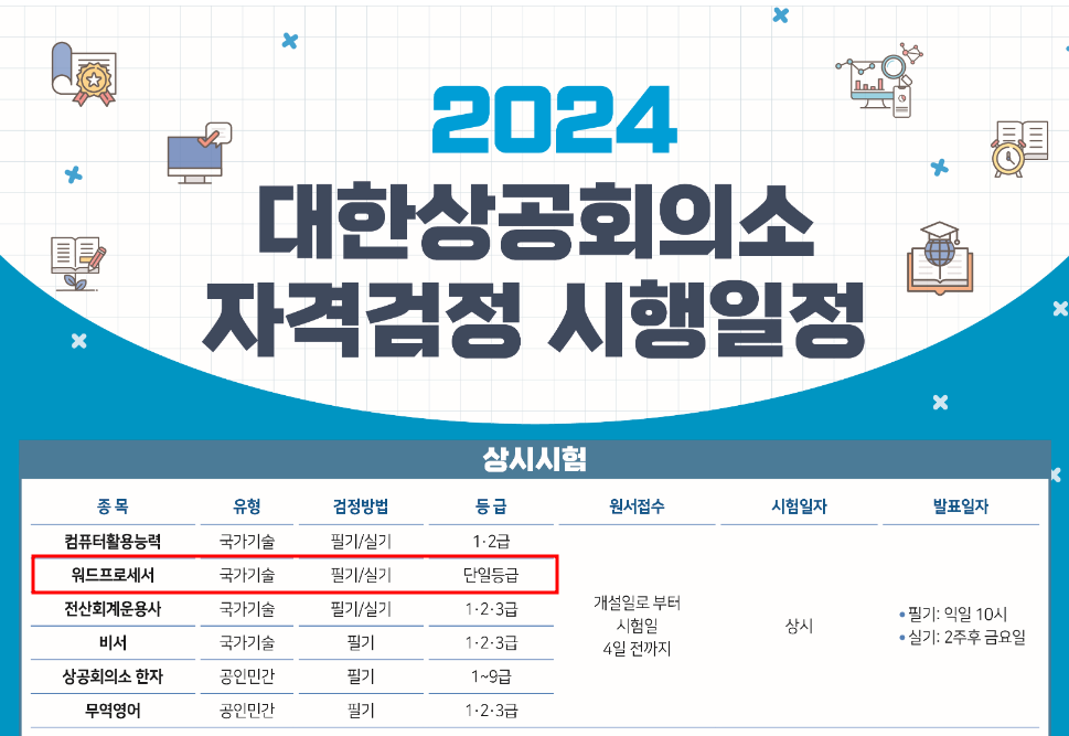 워드프로세서(Word Processor Specialist)는 국가기술자격법에 따라 시행되는 국가기술자격증 중 서비스 분야 자격증으로 대한상공회의소가 자격시험을 시행하고 있는데요. 컴퓨터의 기초사용법과 효율적인 문서작성을 위한 워드프로세서 프로그램 운영 및 편집 능력을 평가하는 대표적인 OA자격증입니다.