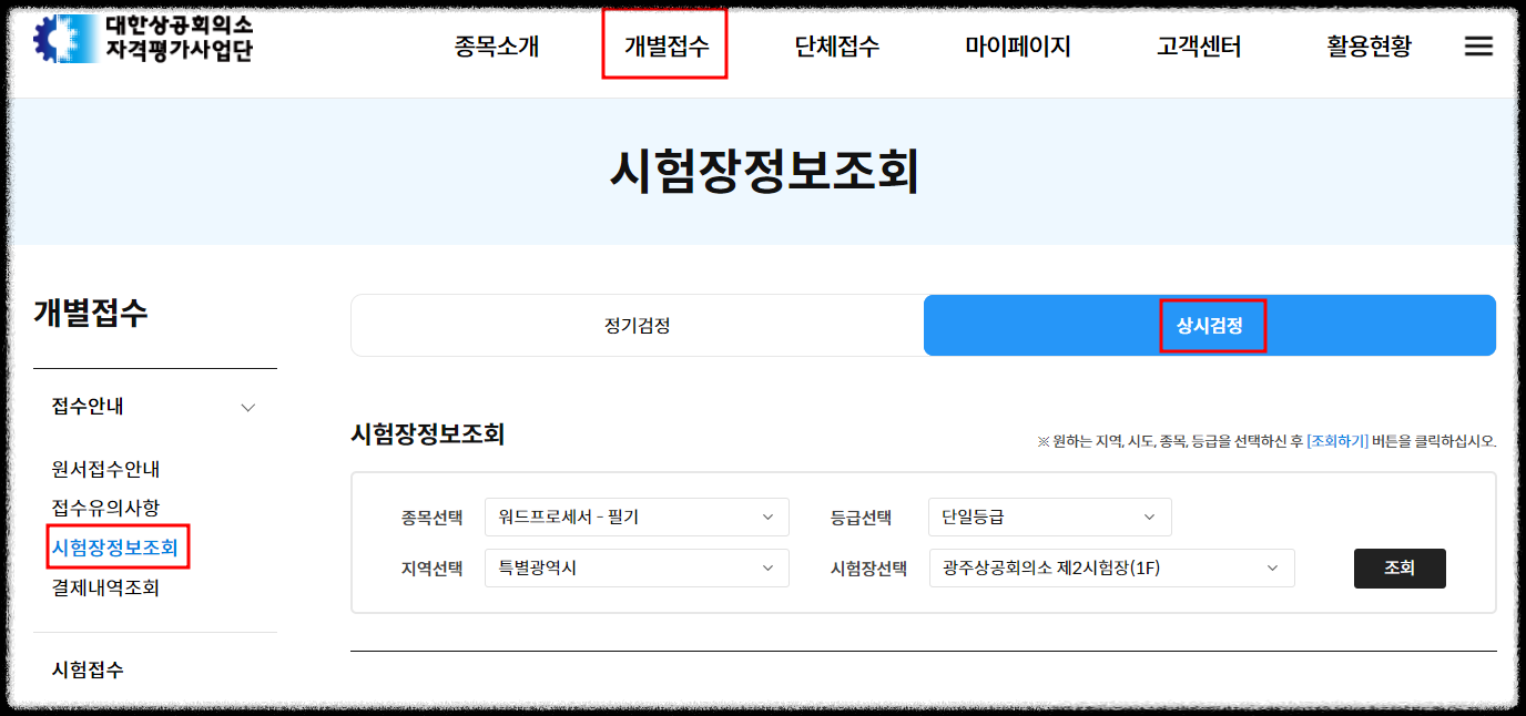 개별접수 탭을 클릭한 후 왼쪽 상단에 있는 시험장 정보조회를 클릭하고 이어서 상시 검정 탭을 클릭하면 종목선택란에서 워드프로세서 필기나 워드프로세서 실기를 선택합니다.