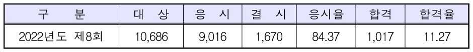 이 중 1,017명이 합격해 합격률은 11.27%를 기록했는데요. 지난 2021년 제7회 합격률이 25.67%였던 것에 비하면 시험 난이도가 올라가 합격률을 하락했음을 알 수 있습니다.