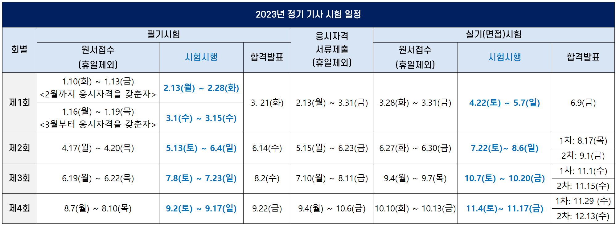 2023년부터는 모든 정기기사 필기시험이 CBT로 시행되며, 예년과 마찬가지로 필기시험과 실기시험 모두 4회 시험이 시행됩니다.