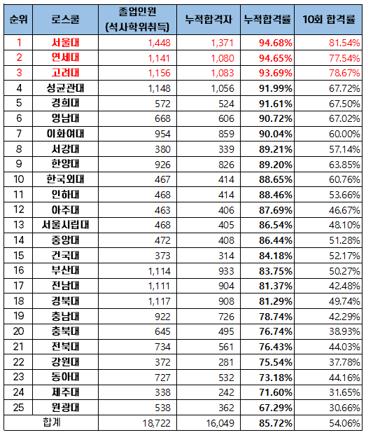 10년간 변호사 시험 누적 합격률 94.68%를 기록한 서울대 로스쿨이 1위입니다.