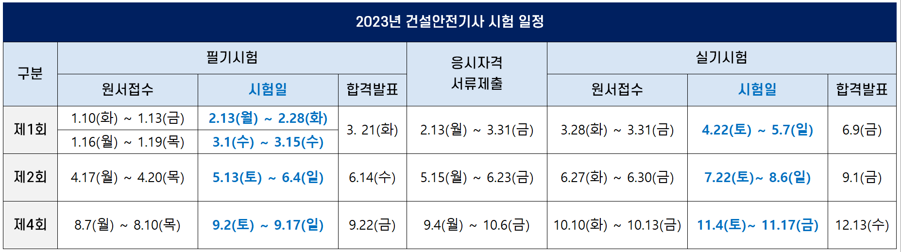2023년 건설안전기사 필기시험은 CBT로 시행되며 원서접수기간, 시험일, 합격자 발표일 등 시험 일정은 다음과 같습니다(모바일 환경에서 표가 깨져 보일 경우 아래 그림을 보시기 바랍니다).