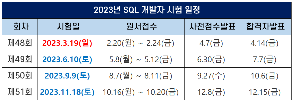 2023년 첫번째 시험인 제48회 SQL 개발자 시험만 일요일에 시행되며, 나머지 제49회, 제50회, 제51회 시험은 토요일에 시행됩니다.