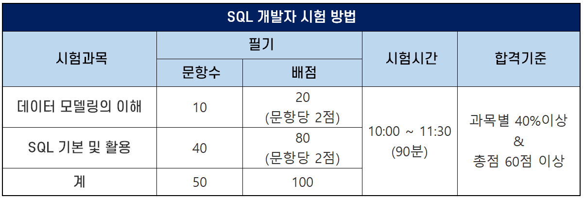 SQLD 시험은 ① 데이터 모델링의 이해, ② SQL 기본 및 활용의 2과목에서 객관식 문제 40문항, 단답형 문항 10문항이 출제되어 총 50문항이 출제되고, 모든 문항 당 배점은 2점으로 100점 만점으로 채점합니다.