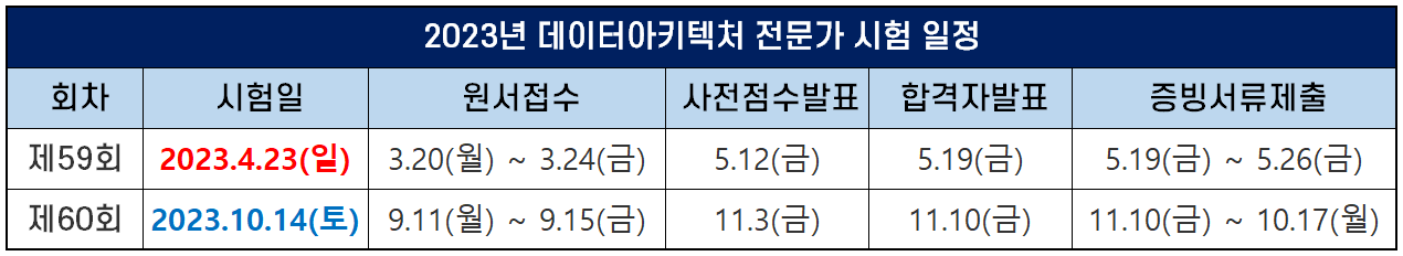 2023년 데이터아키텍처 전문가 시험일, 원서접수기간, 합격자 발표일 등 시험 일정은 다음과 같습니다.
