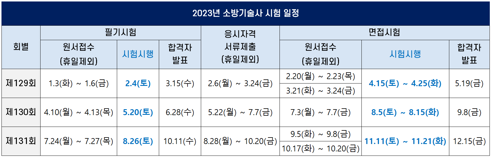 2023년에 시행되는 소방기술사 제129회, 제130회, 제131회 필기 및 면접 시험의 시험일, 원서접수기간, 합격자 발표일, 응시자격 서류제출기간 등 시험 일정은 다음과 같습니다(모바일 환경에서 표가 깨져 보이는 경우 아래 그림을 보세요).