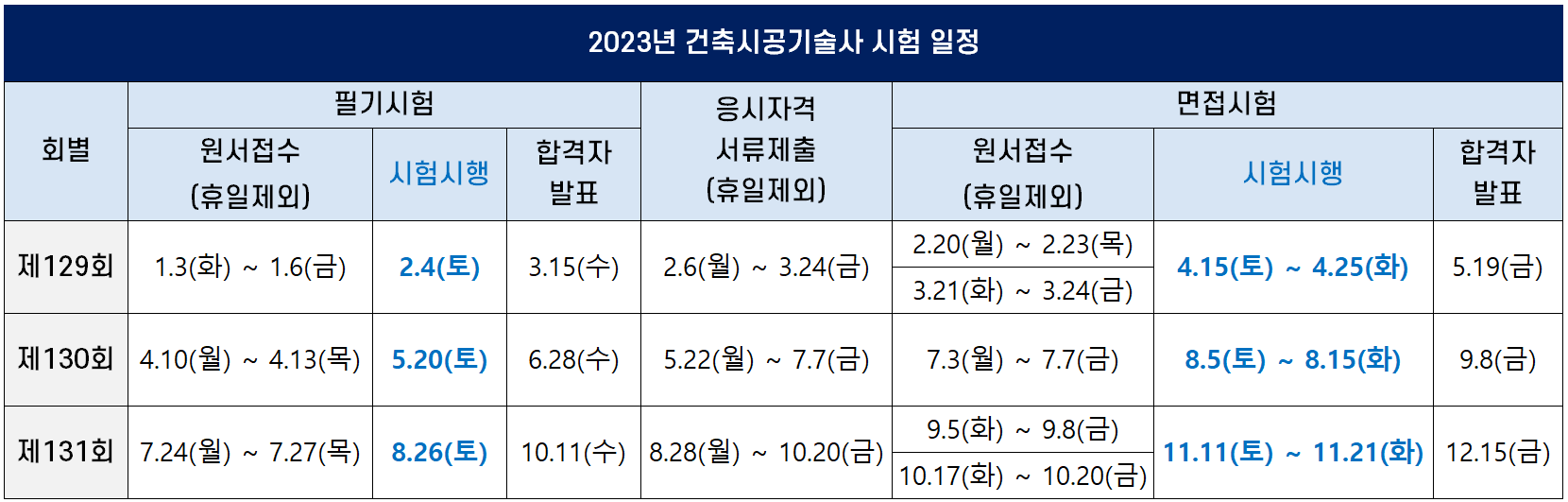 2023년에 시행되는 건축시공기술사 제129회, 제130회, 제131회 필기 및 면접 시험의 시험일, 원서접수기간, 합격자 발표일, 응시자격 서류제출기간 등 시험 일정은 다음과 같습니다(모바일 환경에서 표가 깨져 보이는 경우 아래 그림을 보세요).