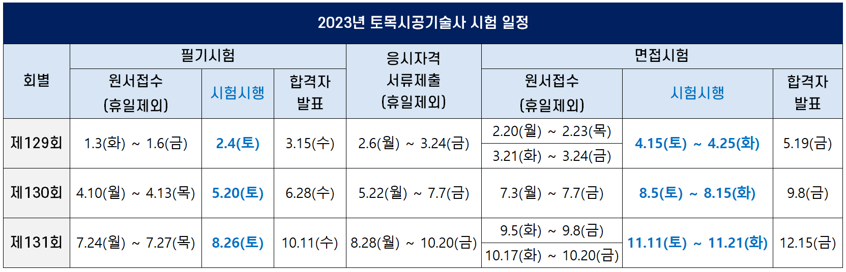 2023년에 시행되는 토목시공기술사 제129회, 제130회, 제131회 필기 및 면접 시험의 시험일, 원서접수기간, 합격자 발표일, 응시자격 서류제출기간 등 시험 일정은 다음과 같습니다(모바일 환경에서 표가 깨져 보이는 경우 아래 그림을 보세요).