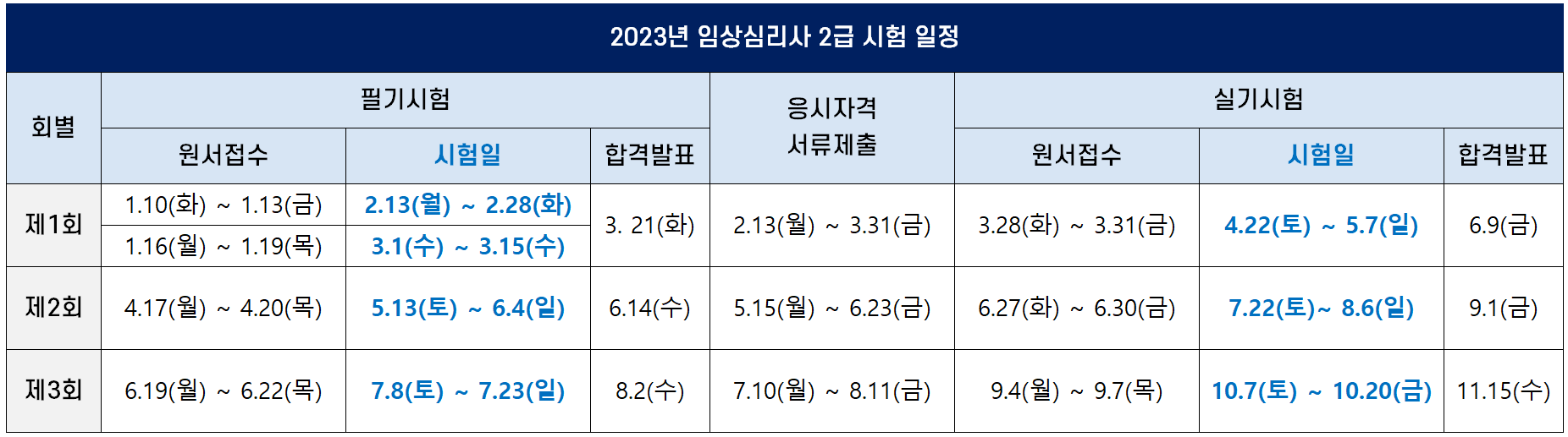 2023년 임상심리사 2급 필기시험은 CBT로 시행되며 원서접수기간, 시험일, 합격자 발표일 등 시험 일정은 다음과 같습니다(모바일 환경에서 표가 깨져 보일 경우 아래 그림을 보시기 바랍니다).