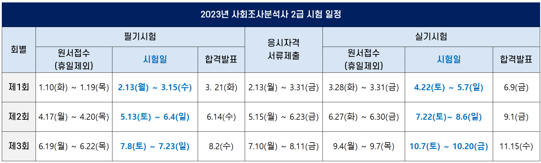 2023년 사회조사분석사 2급 시험 원서접수기간, 시험일, 합격자 발표일 등 시험 일정은 다음과 같습니다(모바일 환경에서 표가 깨져 보일 경우 아래 그림을 보시기 바랍니다).