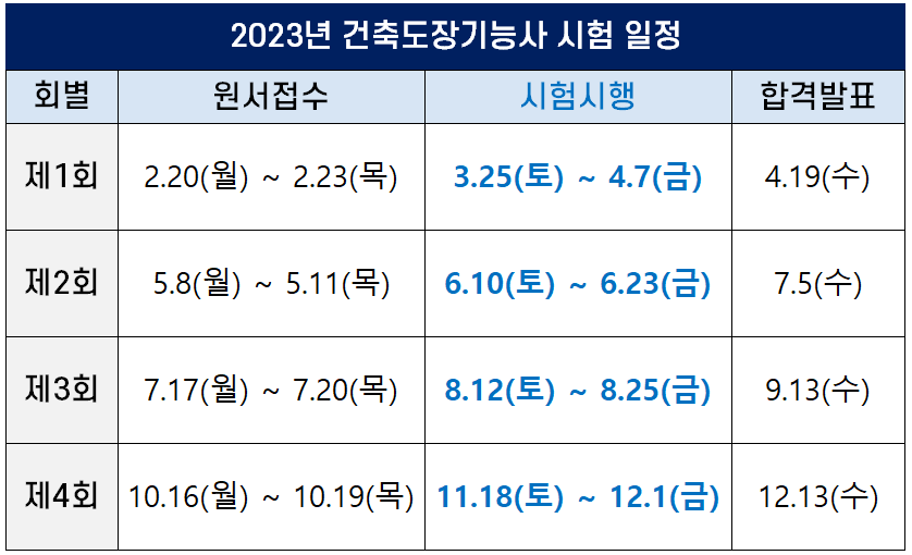 2023년에 시행하는 건축도장기능사 시험일, 원서접수기간, 합격자 발표일은 다음과 같습니다.