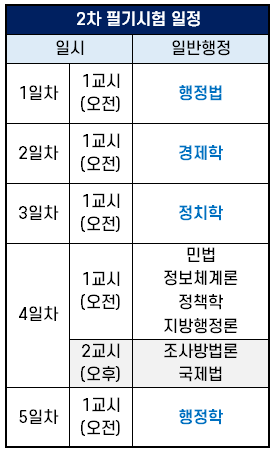5급 일반행정직 2차 시험은 5일 동안 아래 일정에 따라 오전 또는 오후에 시행되는데요. 1교시 오전 시험은 10:00부터 12:00시까지, 2교시 오후 시험은 14:00부터 16:00까지 시행되고, 응시자의 선택과목에 따라 4일차 시험 시간이 다릅니다.