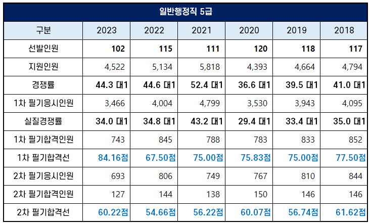 2018년부터 2023년까지 최근 시행된 5급 일반행정직 시험 선발인원, 경쟁률, 필기 합격선 등을 아래 표로 정리했습니다(모바일 환경에서는 표 아래 있는 그림을 보시기 바랍니다).