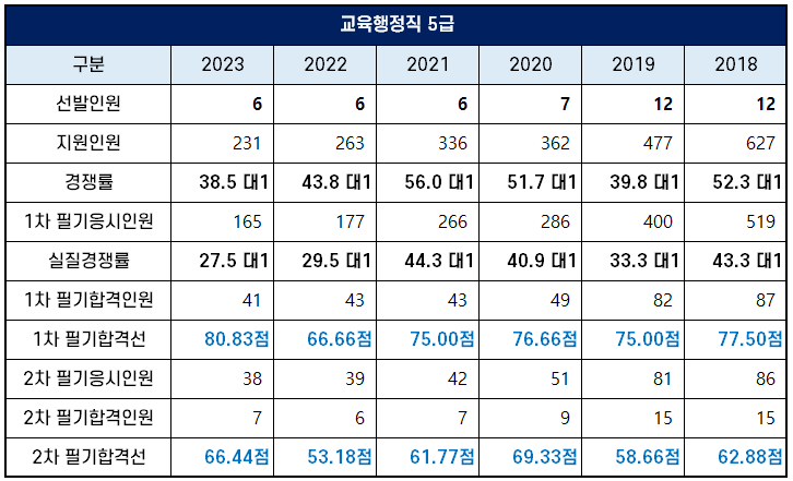 2018년부터 2023년까지 최근 시행된 5급 교육행정직 시험 선발인원, 경쟁률, 필기 합격선 등을 아래 표로 정리했습니다(모바일 환경에서는 표 아래 있는 그림을 보시기 바랍니다).