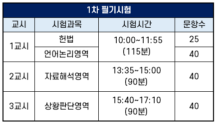 영어와 한국사 과목은 검정시험으로 대체하기 때문에 1차 필기 시험일에는 아래 시간표에 따라 헌법과 PSAT 3가지 영역만 시험을 봅니다. 헌법은 객관식 4지 선택형 25문항, PSAT은 영역 당 객관식 5지 선택형 40문항이 출제됩니다.