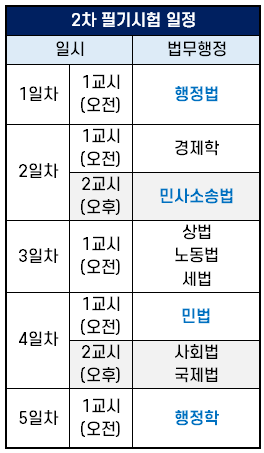 5급 법무행정직 2차 시험은 5일 동안 아래 일정에 따라 오전 또는 오후에 시행되는데요. 1교시 오전 시험은 10:00부터 12:00시까지, 2교시 오후 시험은 14:00부터 16:00까지 시행되고, 응시자의 선택과목에 따라 시험 일정과 시간이 다릅니다.