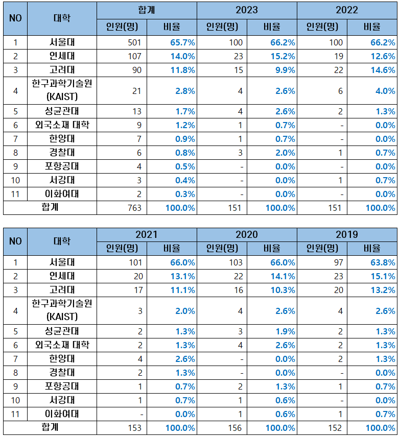 2019년부터 2023년까지 서울대 로스쿨 합격자의 출신 대학은 아래 표와 같습니다.