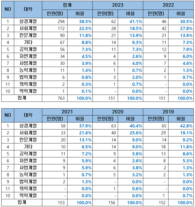 합격자 중 상경계열의 비율이 30~40%로 가장 높고, 이어서 사회계열이 20% 내외를 기록하고 있습니다. 기타는 주로 자유전공학부 출신입니다.