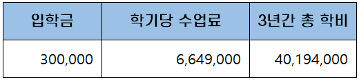 첫 입학 등록금은 입학금과 수업료를 합쳐 약 6백9십만 원이며, 이후 5학기 동안 등록금(수업료는)은 학기당 6백6십만 원이고, 3년간 총학비는 약 4천만 원입니다.