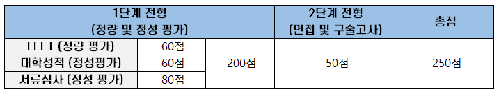 1단계 전형은 200점 만점 기준으로 LEET(법학적성시험) 성적이 60점(30%), 대학성적이 60점(30%), 서류심사가 80점(40%)으로 평가됩니다.