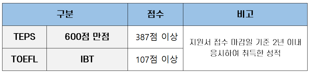 특별전형은 점수 제한 없이 영어 성적을 제출하기만 하면 되고, 일반전형은 다음 표와 같이 New 텝스의 경우 387점 이상을, 토플 IBT는 107점 이상의 성적을 받아야 합니다.