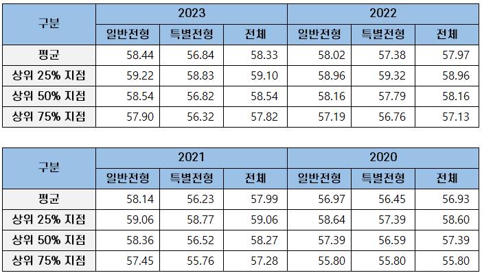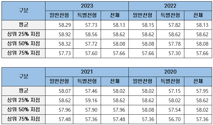 입학전형 점수 산정 반영 비율이 현재와 같이 변경된 2020년부터 2023년까지 서울대 로스쿨 합격자의 대학 학업 성적 점수 통계는 다음 표와 같습니다.