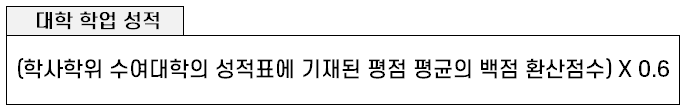 정량평가인 대학 학업 성적은 학사학위 수여대학의 성적표에 기재된 평점 평균의 백점 환산점수에 0.6을 곱해 산정합니다.
