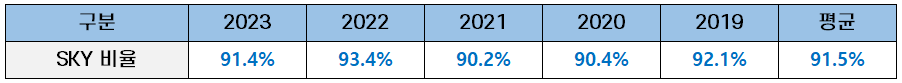 서울대 로스쿨 합격생 중 학부가 서울대, 연세대, 고려대, 즉 SKY 출신 비율은 90%가 넘습니다. 2022년에는 서울대 로스쿨 합격자의 93.4%가 SKY 출신일 정도로 높은 비중을 차지했습니다.