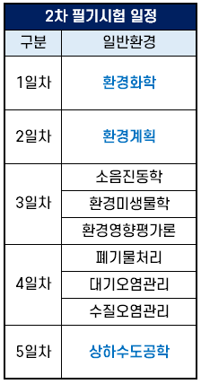 5급 환경직 2차 시험은 1일 1과목 씩 4일 동안 시행되는데요. 과목당 시험 시간은 120분(10:00 ~ 12:00)이며, 5일에 거쳐 다음 일정에 따라 시험이 시행되기 때문에 응시자의 선택과목에 따라 시험 날짜가 달라집니다.