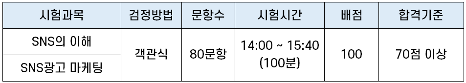 SNS광고마케터 시험은 객관식 4지 선택형 문제 80문항이 출제되며 시험 시간은 2시부터 3시 50분까지 100분 동안 시행됩니다.