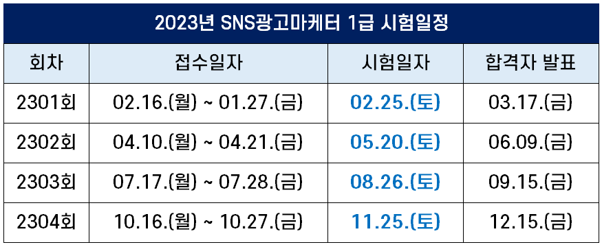 2023년에 시행되는 SNS광고마케터 시험일, 원서접수기간, 합격자 발표일 등 시험 일정은 다음과 같습니다.