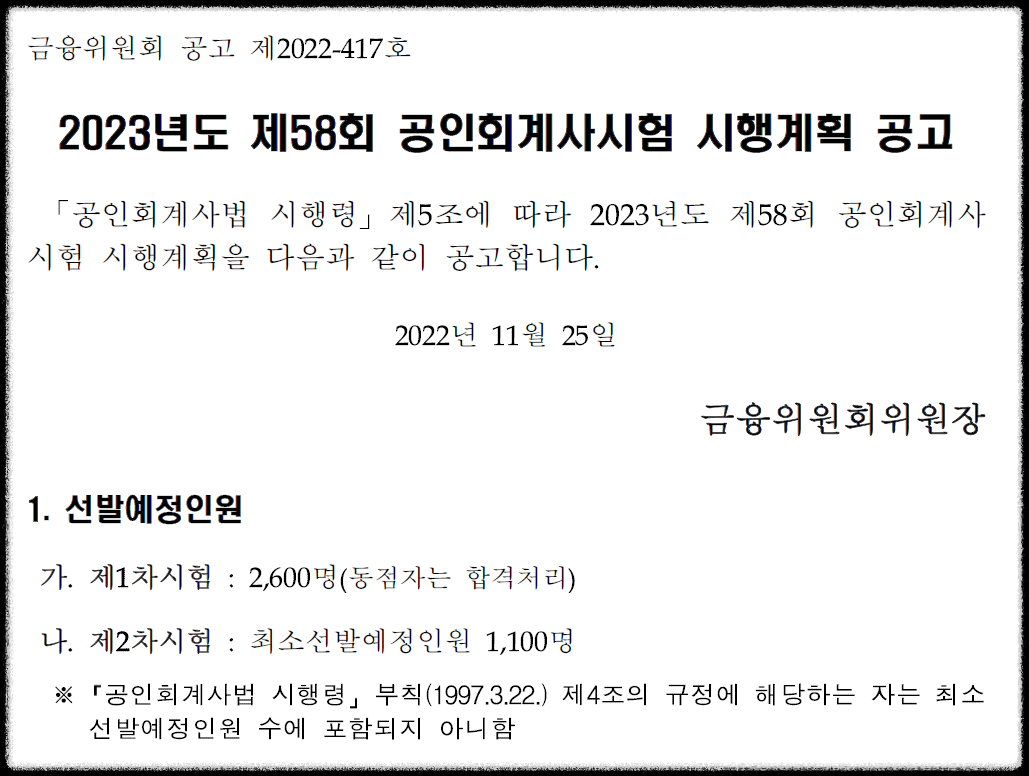 2023년에 시행되는 제58회 공인회계사(CPA) 시험 시행계획이 공고되었습니다.