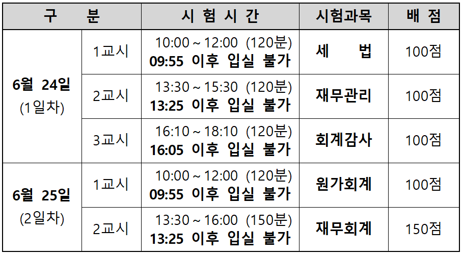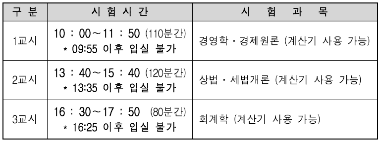 공인회계사 1차 시험은 오전 10시부터 오후 5시 50분까지 아래 시간표에 따라 3교시로 나누어 실시하는데요. 시험당일 시험장 입실은 오전 8시부터 가능하고, 매교시 시작 30분전까지는 입실해야 하며, 매 시험시작 5분 전까지 시험실에 입실하지 않은 사람은 그 과목 및 나머지 과목 시험 응시가 불가능합니다.