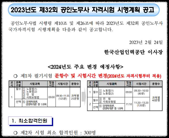1986년에 처음 시험을 시행한 공인노무사는 2023년 제32회 시험을 시행하는데요. 최소합격인원은 300명입니다.