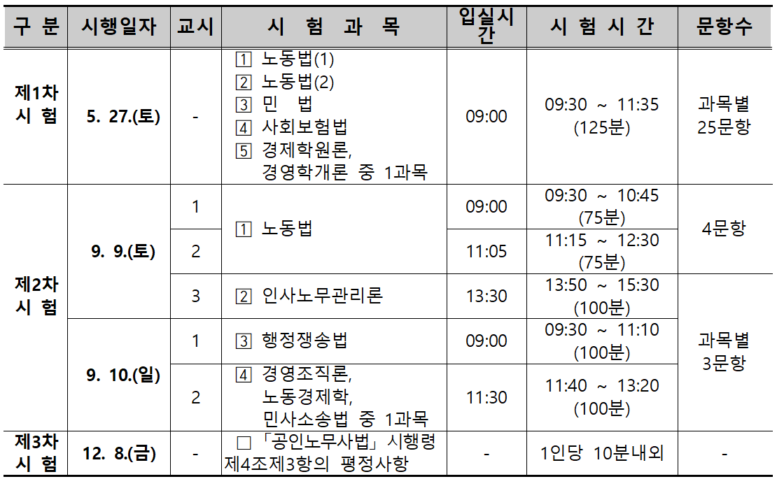 2024년 공인노무사 시험 일정 및 시간표 변경 사항 (33회 시행계획 공고)