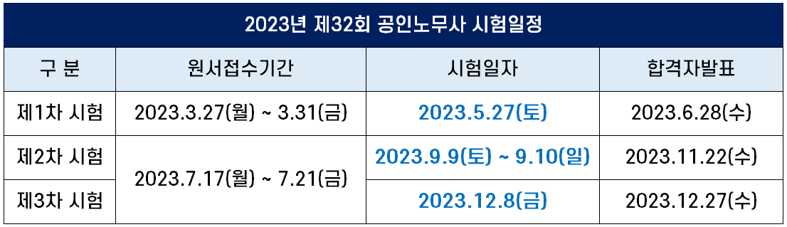 2023년에 시행되는 공인노무사 1차, 2차, 3차 시험일, 원서접수기간, 합격자 발표일 등 시험일은 다음과 같습니다.