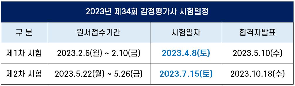 2023년 제34회 감정평가사 1차 및 2차 시험일, 원서접수기간, 합격자 발표일 등 시험 일정은 다음과 같습니다.