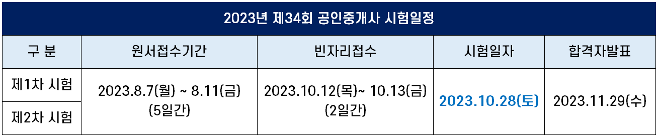 2023년 제34회 공인중개사 시험은 10월 28일(토)에 시행되며, 원서접수기간 및 합격자 발표일은 다음과 같습니다.