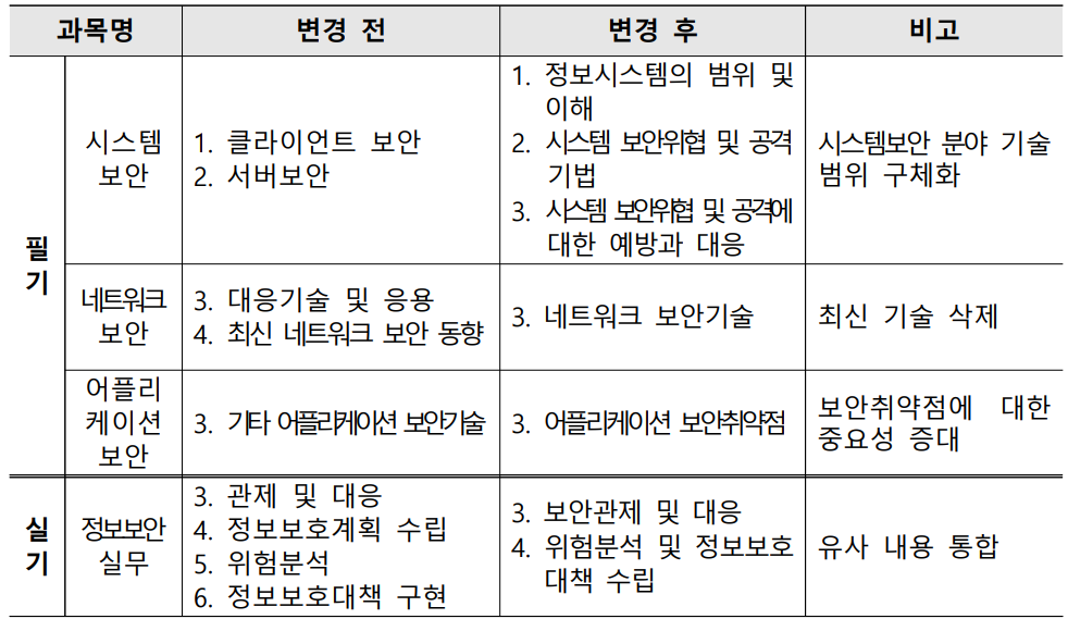 정보보안기사 출제기준이 개정되어 2023년부터는 변경된 출제기준이 적용되는데요. 직무범위를 고려한 보안 정책·대책 수립 등의 내용이 삭제되고, 기술변화와 현장수요를 반영해 클라이언트·서버를 시스템으로 통합하는 등의 변화가 있습니다.