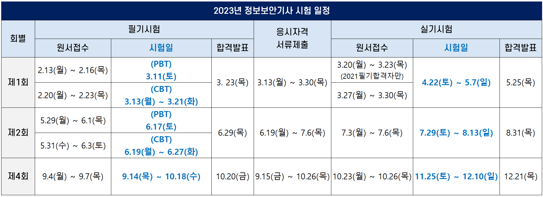 2023년 정보보안기사 필기시험 일정은 다음과 같습니다(모바일환경에서 표가 깨져 보이는 경우 아래 그림을 보세요).