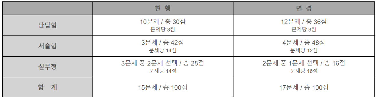 2023년에 시행되는 정보보안기사 실기시험 부터는 문제 유형과 배점이 아래와 같이 변경됩니다.
