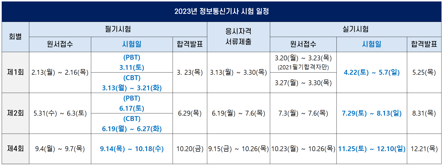 2023년 정보통신기사 필기시험 일정은 아래 표와 같은데요(모바일 환경에서 표가 깨져 보이는 경우 아래 그림을 보세요).