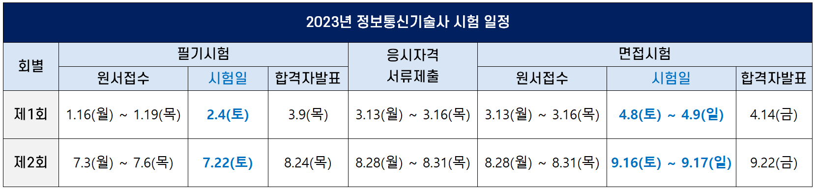 2023년에 시행하는 정보통신기술사 필기 및 면접 시험일, 원서접수기간, 합격자 발표일, 응시자격 서류 제출기간 등 시험일정은 다음과 같습니다(모바일 환경에서 표가 깨져 보이는 경우 아래 그림을 보세요).