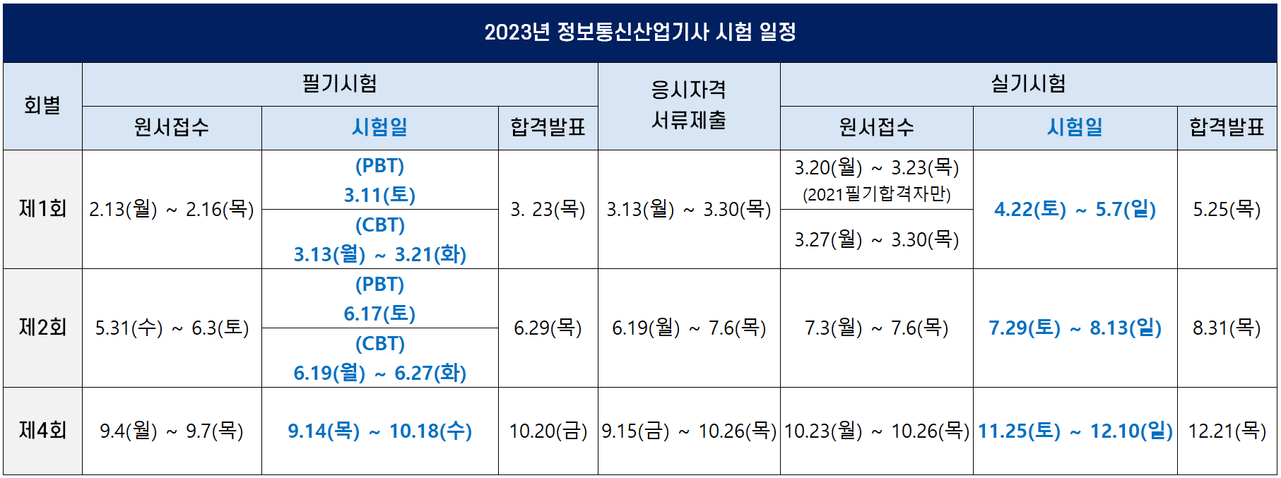 2023년에 시행되는 정보통신산업기사 필기 및 실기 시험일, 원서접수기간, 합격자 발표일 등 시험 일정은 다음과 같습니다(모바일 환경에서 표가 깨져 보이는 경우 아래 그림을 보세요).